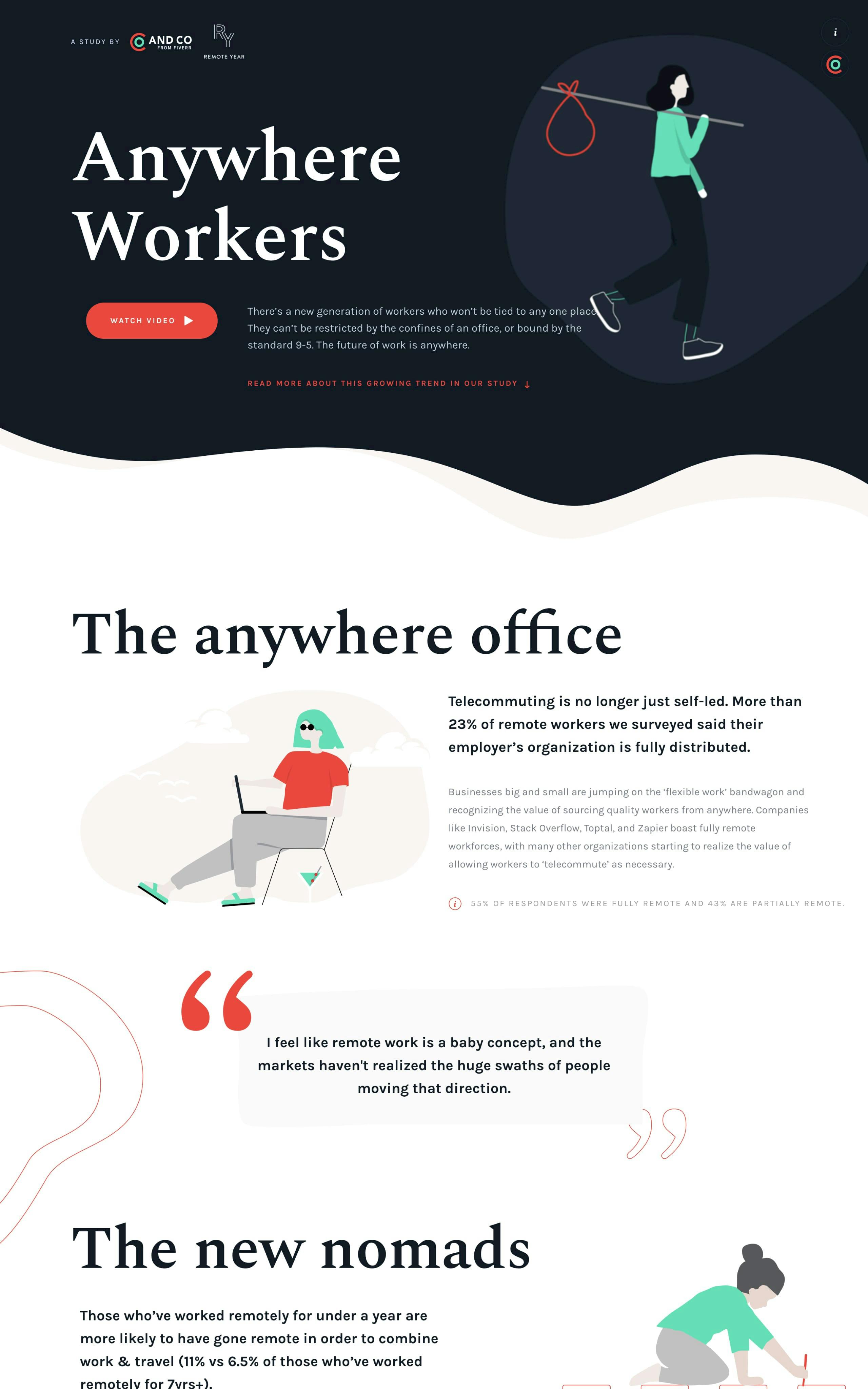 Super long-scrolling Landing Page presenting the Remote Work & Digital Nomads annual report by AND CO and Remote Year. Neat touch with the scroll progress bar and also great to see the consistently schemed characters and infographics throughout. (I’ve cropped the long screenshot for load time purposes)